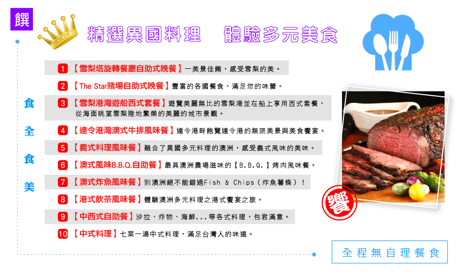 早餐:飯店內早餐 午餐:澳式炸魚風味餐 晚餐:達令港灣澳式牛排風味餐